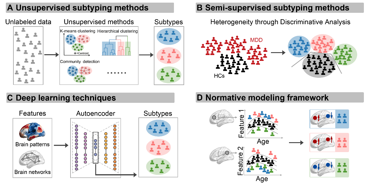 抑郁症是全球发病率最高、疾病负担最重的精神障碍之一。由于患者在症状表现、疾病进程及治疗反应等方面存在显著差异,传统基于症状的诊断和治疗策略面临重要挑战。近年来,多模态磁共振成像为揭示抑郁症脑结构和功能异常提供了重要手段。然而,小样本研究结果往往不一致,而大样本研究虽然更稳健,但通常只表现出中等效应量,提示抑郁症脑异常具有明显的个体差异。在此背景下,研究者开始尝试利用脑影像特征识别抑郁症的神经生物学亚型,以更好地理解其复杂病理机制,并为精准诊疗提供客观依据。