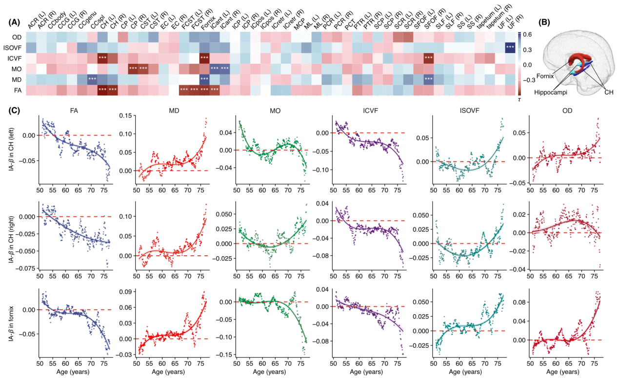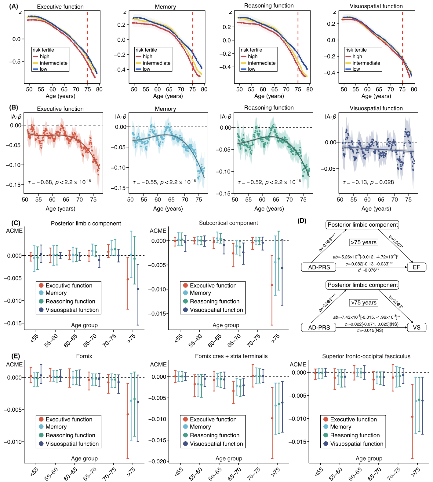 相比于低遗传风险个体,高AD-PRS个体在海马、丘脑和内侧颞叶灰质体积随老化加速萎缩(图1),并表现出脑室扩大和白质完整性受损(尤其在穹隆与扣带回,图2);这些结构改变呈显著年龄放大效应:约自55岁起出现差异,在75岁后最为明显。此外,高AD遗传风险者在执行功能、记忆和推理功能上随老化加速衰退,这一趋势主要通过海马-丘脑及其白质纤维连接的结构退化所中介(图3)。进一步敏感性分析表明,APOE基因在AD遗传风险中具有主导作用,但非APOE多基因变异也对白质微结构完整性和执行功能有一定影响。这些非APOE遗传风险同时与脑血管及免疫通路相关,提示AD与心脑血管疾病在遗传层面存在潜在交叉。
