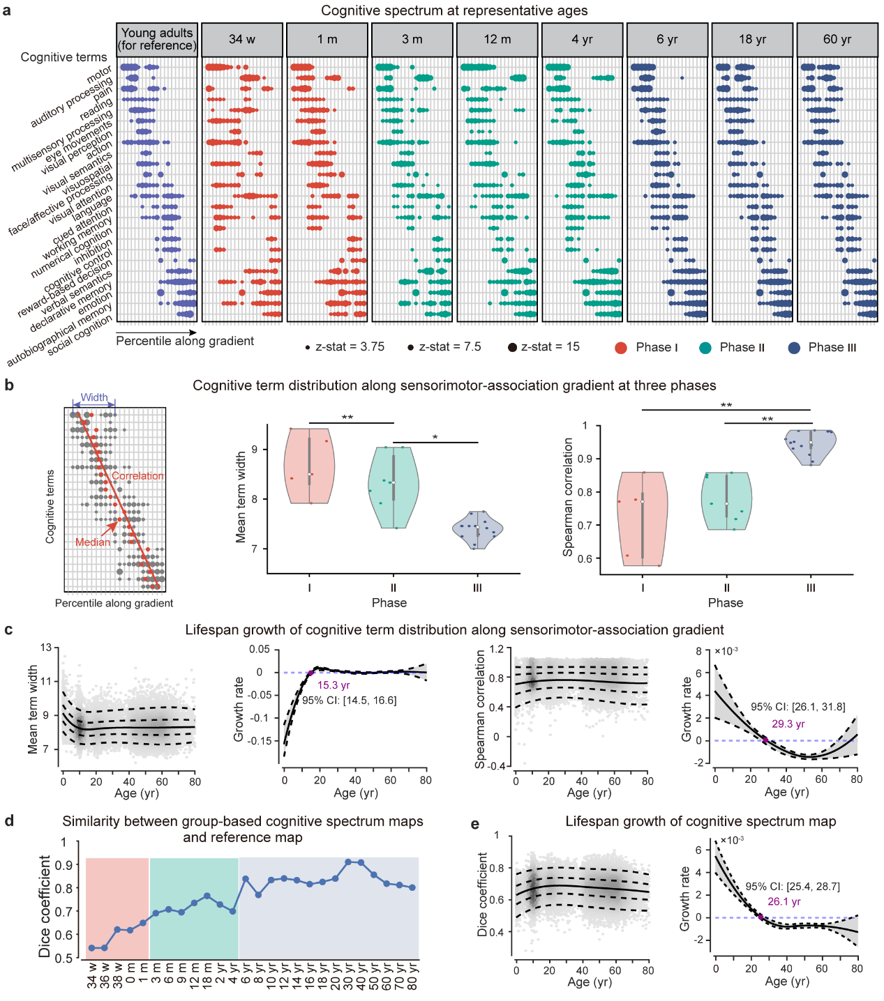研究表明,人类大脑皮层的功能组织沿初级感觉区到高级联合区的连续轴展开,构成感觉-联合层级(Sensorimotor-association, S-A)。这一层级结构被视为连接感知加工与高级认知功能的核心组织架构,且与个体发育、衰老及多种神经精神疾病的发生发展密切相关(Xia et al. 2022a, Xia et al. 2022b, Zhao et al. 2026)。然而,既往研究多受限于婴幼儿、儿童青少年或成年等特定阶段,且样本量普遍偏小。目前,对于人类大脑皮层的S-A功能层级图谱在全生命周期中的形成、重组与稳定过程,及其与跨尺度多模态脑发育与认知发展之间的关联,仍缺乏系统性研究。