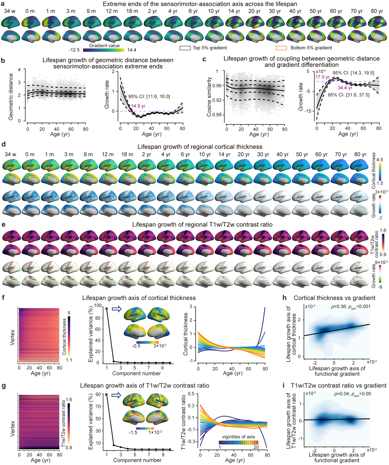 图4 人类大脑皮层感觉-联合层级(S-A梯度)与大脑皮层结构(皮层厚度与T1/T2w髓鞘化指标)的关联发育规律