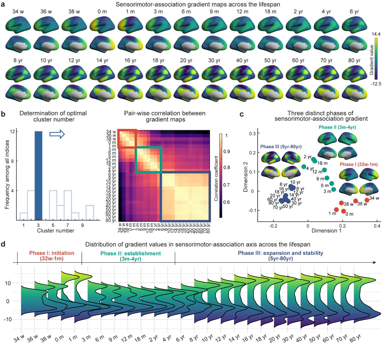 第二阶段:形成期。该阶段跨越婴儿期至幼儿早期(约3月龄~4岁),其核心特征为脑功能组织发生显著转变:前后侧梯度被感觉-联合皮层梯度取代。婴儿早期(约3~9月龄),前后侧梯度范围收窄,且沿该轴出现多个功能峰值,反映皮层功能组织的分化程度提升。大约在婴儿晚期与幼儿早期(约1岁~4岁),经典的S-A轴正式形成。
