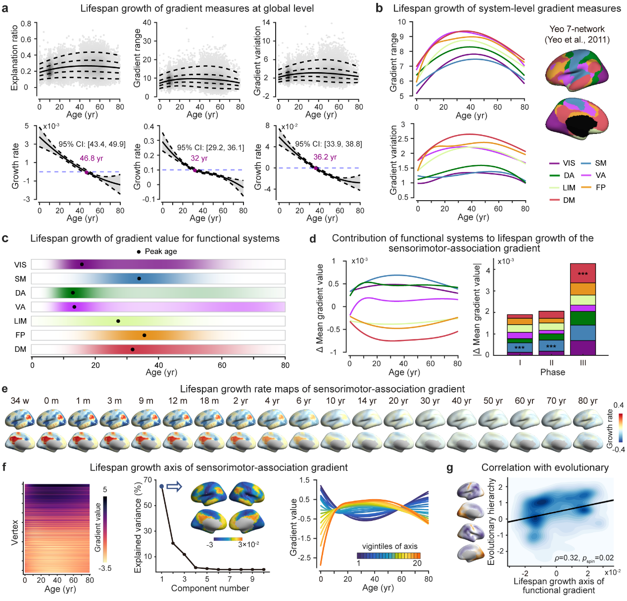 在全局层面,大脑皮层S-A梯度的多个指标均呈现非线性变化,并在成年期达到峰值,其中S-A梯度的解释率在46岁左右达到峰值,梯度范围和变异度分别在32岁和36岁左右到达峰值。在功能系统层面,不同网络表现出明显的差异:默认网络和额顶网络等高阶系统具有更高的梯度分化程度,而视觉与感觉运动系统整体分化相对较低;同时,不同系统达到峰值的年龄也不尽相同,其中视觉和注意网络在青春期达到峰值,而感觉运动网络、默认网络和额顶网络则在成年期达到峰值。在区域层面,梯度变化广泛分布于全脑,在生命早期变化最为显著。研究进一步识别了主导生命周期变化的发育轴,该轴能够解释发育过程中的主要空间变异(图2)。