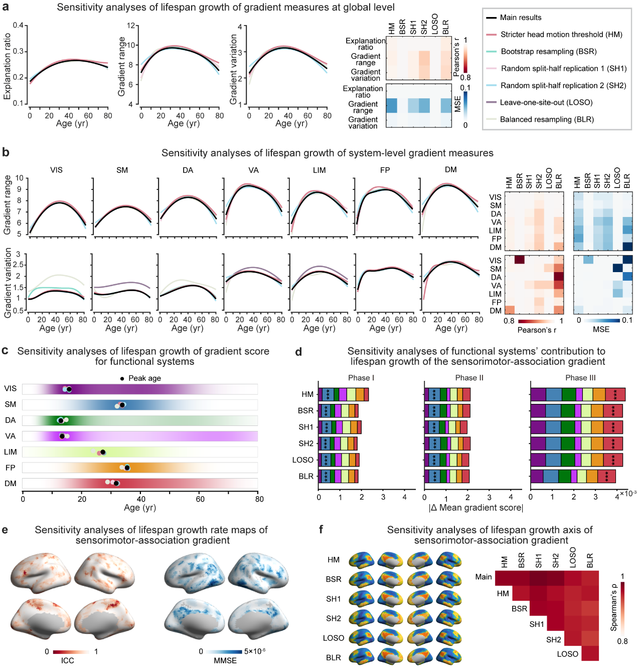 该研究开展了系统的敏感性分析,通过严格头动控制、重采样、分半重复、逐站点剔除及样本均衡重采样等多种策略进行验证。结果显示,不同分析条件下所得到的结果具有很高的稳健性和可重复性(图6)。