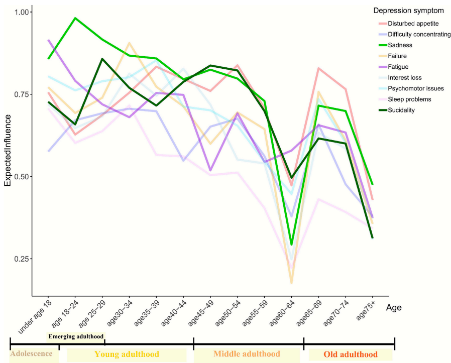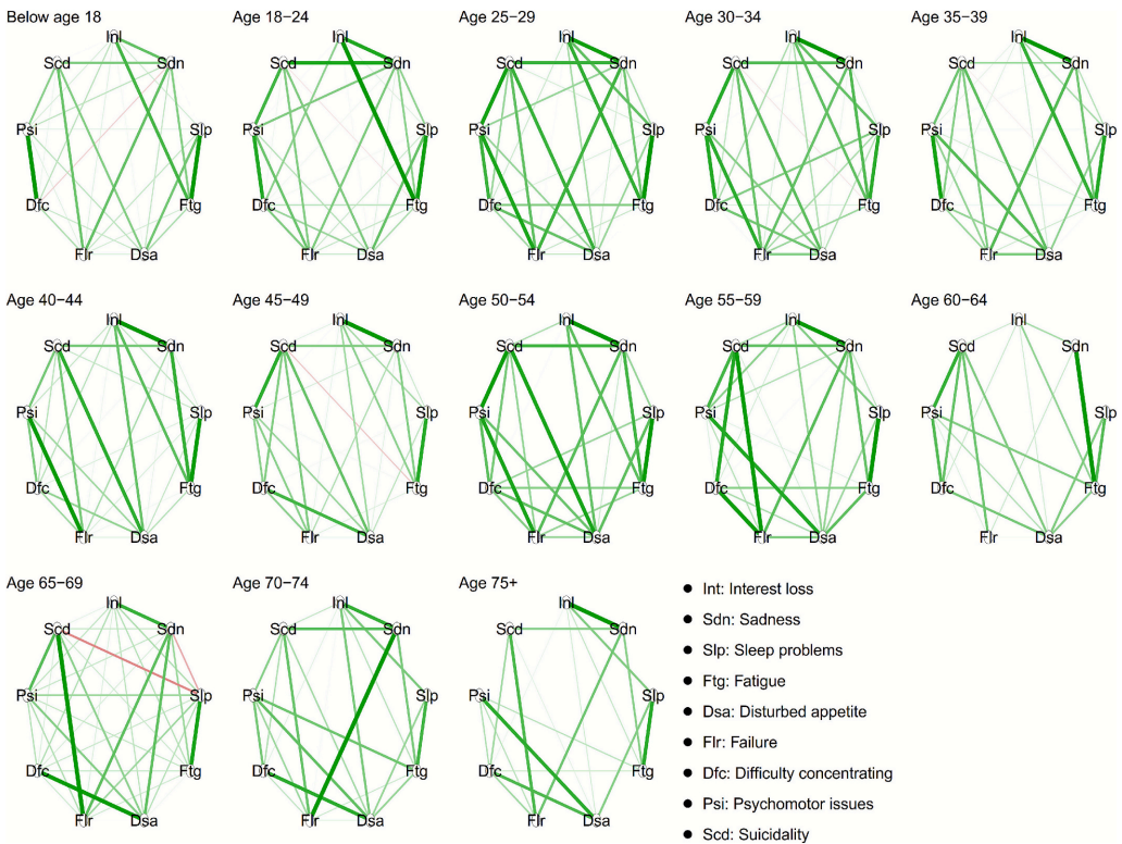 研究采用网络分析方法,将9个抑郁症状(如情绪低落、兴趣丧失、疲劳等)视为相互关联的网络,通过分析症状之间的关联强度,识别出每个年龄段最核心的抑郁症状。