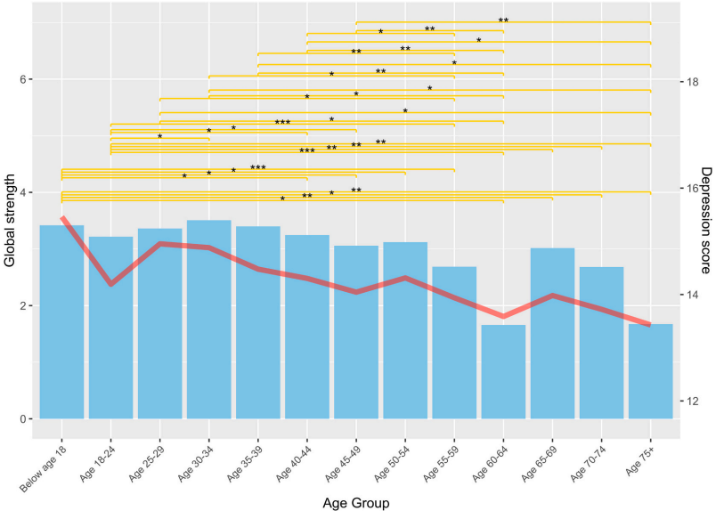 全局网络强度(GNS,可以理解为抑郁症状网络的整体紧密程度)随年龄呈现有趣的波动。